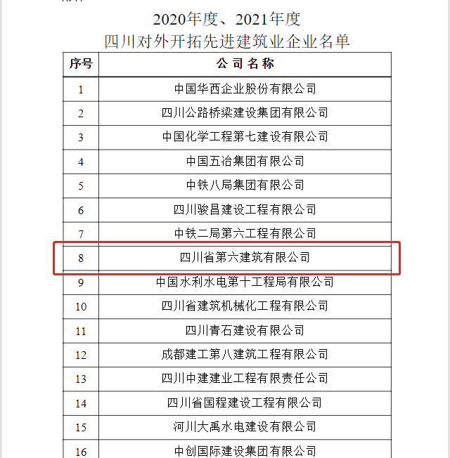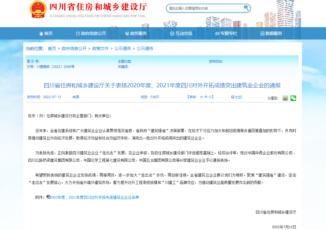 經過為期5個工作日的公示,近日,四川省住房和城鄉建設廳正式對2020年度、2021年度四川對外開拓成績突出的60家建筑業企業進行了通報表揚,公司位列其中!
