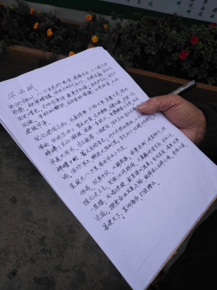 “欸乃一聲山水綠”,這個字念“aǐ,三聲”,這句話的意思是青山綠水間傳來陣陣的搖櫓聲。我一邊在腦海里急速搜尋著《華西賦》注釋所留存的點滴記憶,一邊班門弄斧的回答著師傅的提問,而這位師傅,一邊思慮著不解之處,一邊謄抄著這篇1010字的《華西賦》。