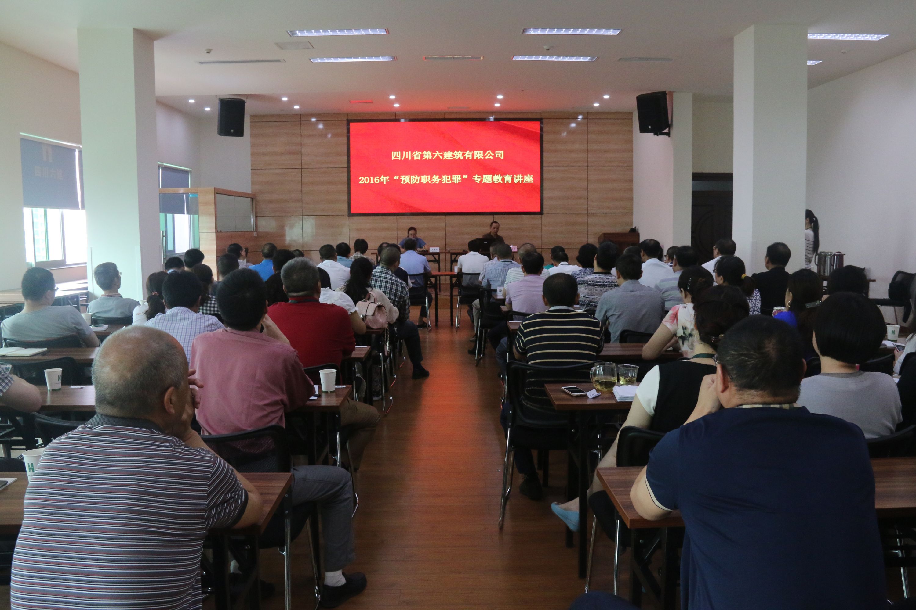 6月1日,公司邀請金牛區檢察院反貪局局長劉志勇以《樹立廉潔從業意識 遠離職務犯罪》為題,向公司領導班子成員、中層管理人員共64人做了一堂預防職務犯罪專題教育講座。公司領導凌鋒、馬洪力、袁玉家、邱山明、趙尤蕾出席講座。公司各部門負責人、高級主管;成都地區各單位黨總支書記/直屬黨支部書記、總經理;各單位部門負責人和項目經理代表參加講座。公司紀委書記、工會主席趙尤蕾主持講座。