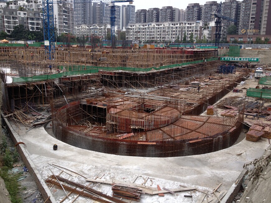 項目簡介:“郫縣重百漢正廣場”是郫縣政府的重點建設項目,大型城市綜合體工程。位于郫縣郫筒鎮,緊鄰郫縣政務中心,項目主立面臨郫縣主干道-東西大街,工地左側有高壓電網及高壓電站,施工場地非常狹窄。本工程共有2棟獨立塔樓、3個商業裙樓及一個地下車庫。總占地面積19637.92㎡,建筑面積111546.97m2,建筑總高度達99.40m。地下室筏板基礎最厚達到1900mm,底板設有抗浮錨桿。